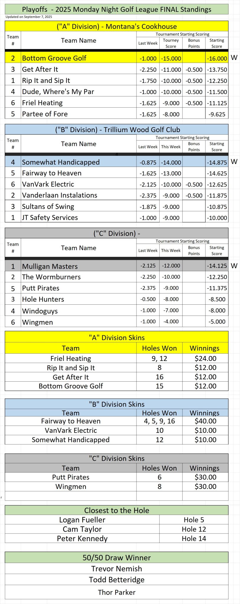 “A” Division Winners (Bottom Groove Golf – Kyle Coolen, Will Bardwell, Evan Corbett, Riley Allen)