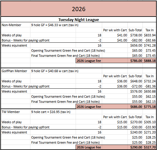 You can see a breakdown of the costs for each player type (Member, Golf Plan, & Non-Member) in the image below. If we have to cancel one of the nights due to poor weather conditions, we will issue a rain-check for the 9 hole green fee and cart, valid during twilight hours from Monday to Thursday.